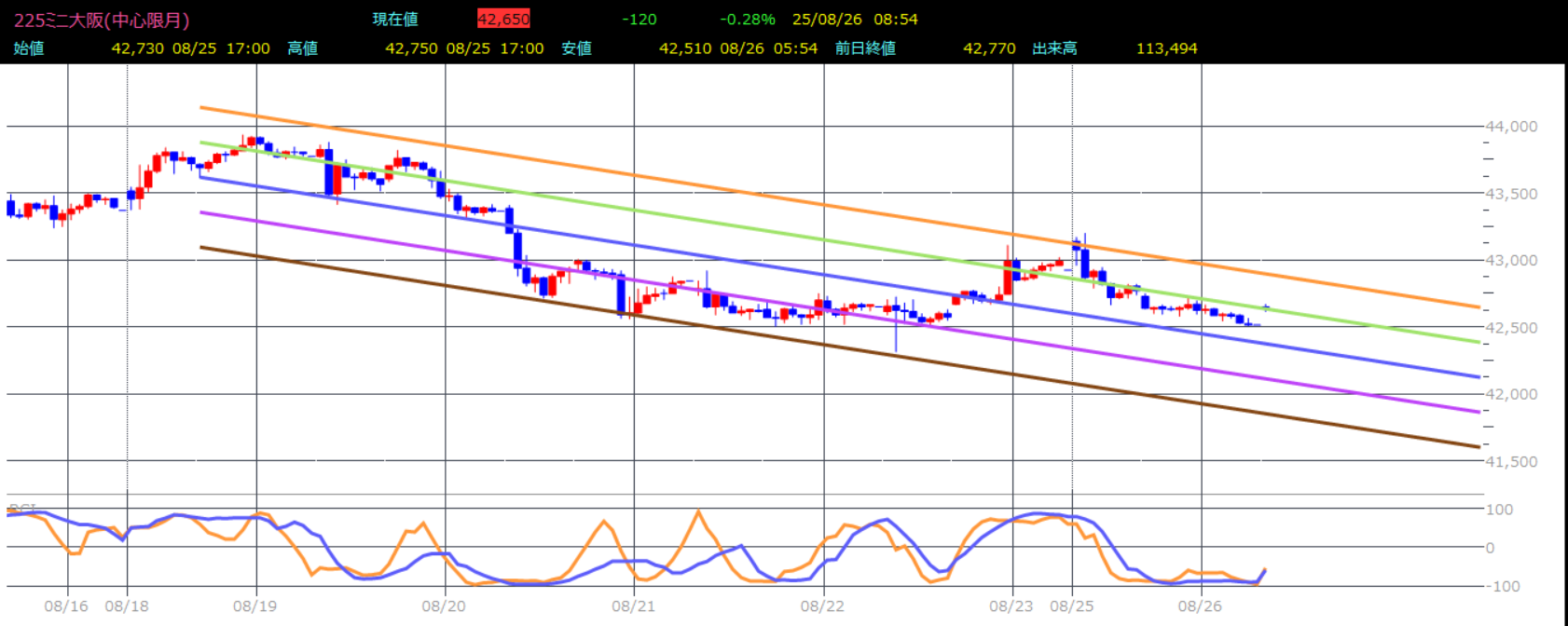 日経225は、継続中。8:57 投稿日: 2025年8月26日 投稿者: takahashi こちらのチャートは、日経225ミニ60分足になります。回帰トレンドは、下向き継続となります。そのため、42000円後半は売り物が出やすいと考えます。しかも、トレンドは2日~3日間変化しないと予想していますので、引き続き売り方針継続とします。 昨日、43000円台の売りは、前日高値を終値ベースでストップロスに設定し、そのまま継続とします。 商品先物 ブログランキングへ にほんブログ村