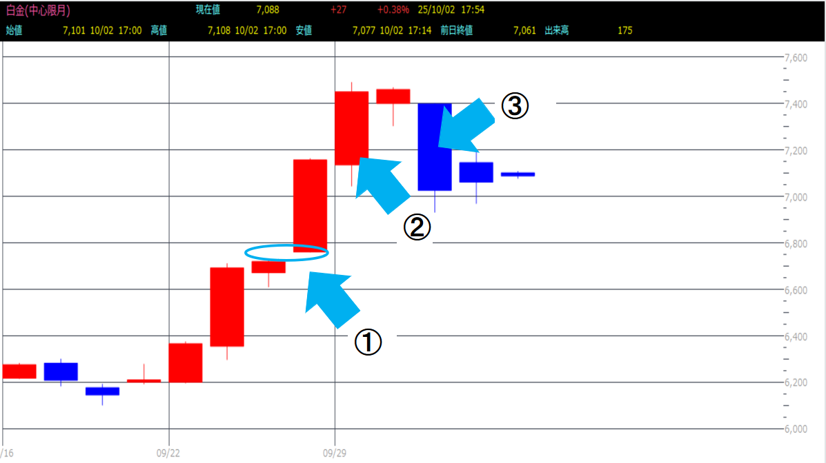 先ほど、私が述べていたことは、上記のチャートで示しています。大陽線と大陰線の存在を理解することができれば、なんとなくイメージすることができます。相場は、可能性で動くしかありません。よって、時間を意識した上で①以下は買い拾われやすいと考え、買い方針。7000円台は様子見とします。