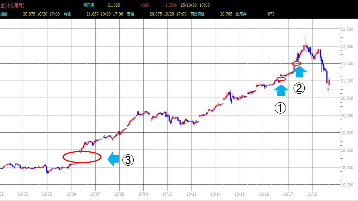 大阪金は、特に言うことはありません。一つ言うとするならば、やり過ぎです。ただし、これから先もあり得る動きです。なぜならば、既に大阪金は20000円を上回っているため、1000円の変動だとしても5%しか動いていないわけです。5%は押し目です。10~15%は修正安です。まずは、ここまで想定しておくのが良いでしょう。