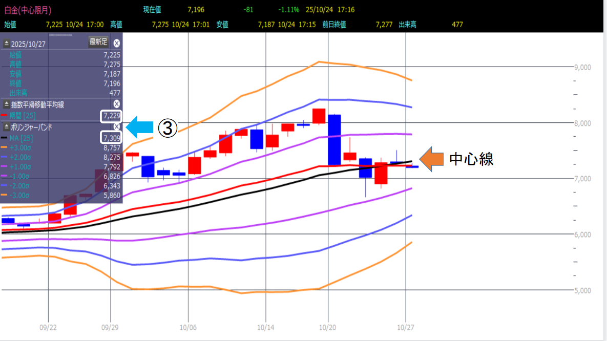 大阪白金は、やはり昨日25日線と中心線を維持したため、7507円まで反発しました。しかし、本日の日本時間では高値から200円以上失速しました。