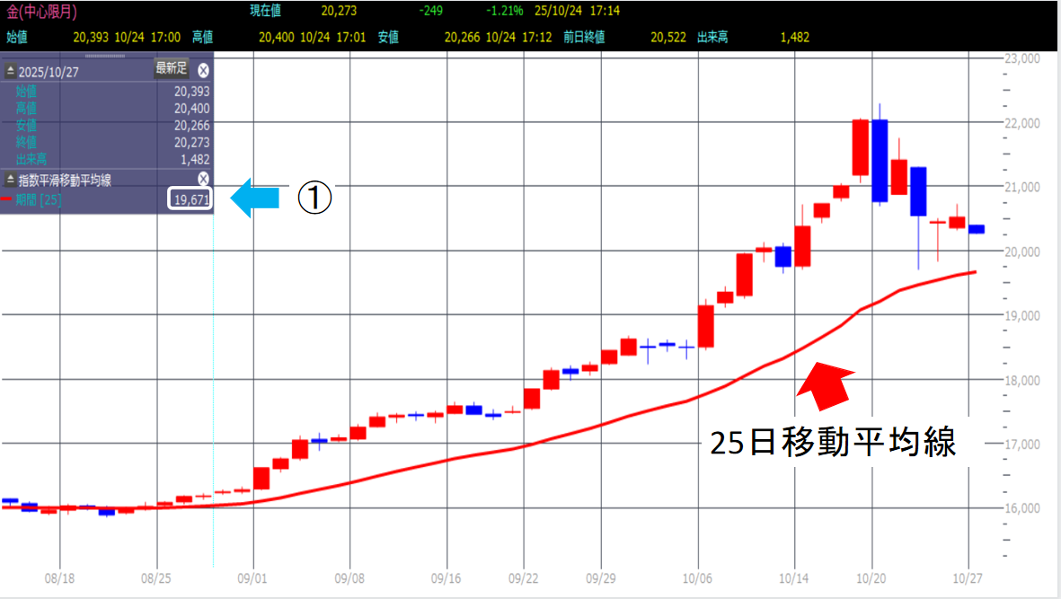 こちらのチャートは、大阪金日足に25日移動平均線を重ね合わせたものです。ここで注意すべき点は2つ、①25日線の水準②前日安値を下回って終えたか③10月20日の大陰線、相場上昇のブレーキ役の存在です。相場は、動きの中で、投資家に錯覚をもたらします。その錯覚が、相場への感情になり、飛びついたり、投げ売ったりしてしまいます。つまり、相場を冷静に見ることができなくなります。そうならないためにも、常に『~かもしれないトレード』を心がけていきましょう。
