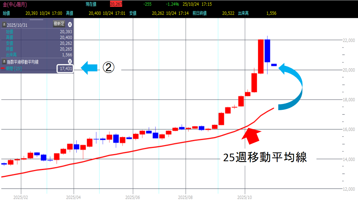 こちらのチャートは、大阪金週足に25週移動平均線を重ね合わせたものです。なぜ、私が25本線を伝えているかと言いますと、個別株でもそうですが25日線との乖離率によっては規制が強化されます。つまり、25本線とは運命共同体であるということです。木(日足)を見て、森(週足)も見ると、何となく気が付くこともあります。まだ25週移動平均線との乖離が大きいため、価格修正、若しくは日柄修正が必要かもしれません。