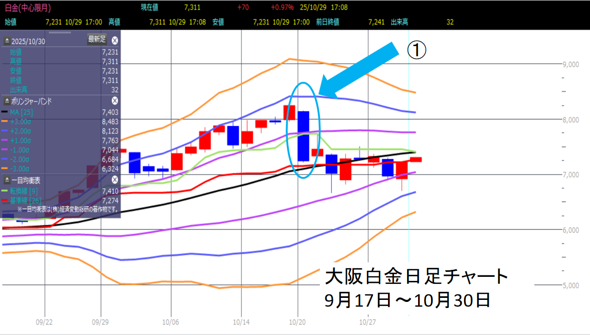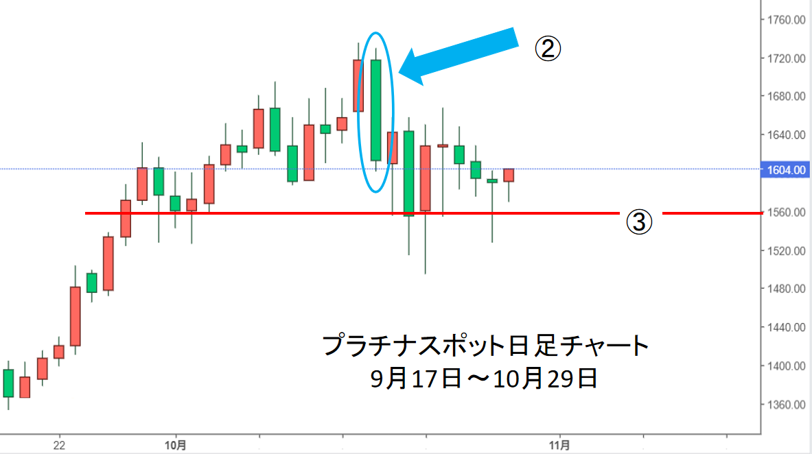 こちらのチャートは、プラチナスポット日足です。こちらでは、②10月17日の大陰線が相場のブレーキ役になっていると思います。しかし、その反面、③以下が相場をサポートしています。現に、10月27日、28日は中国実需筋の買いが目立っていました。そのように考えますと1550~1650ドルレンジを意識しながらトレードするのが良いでしょう。