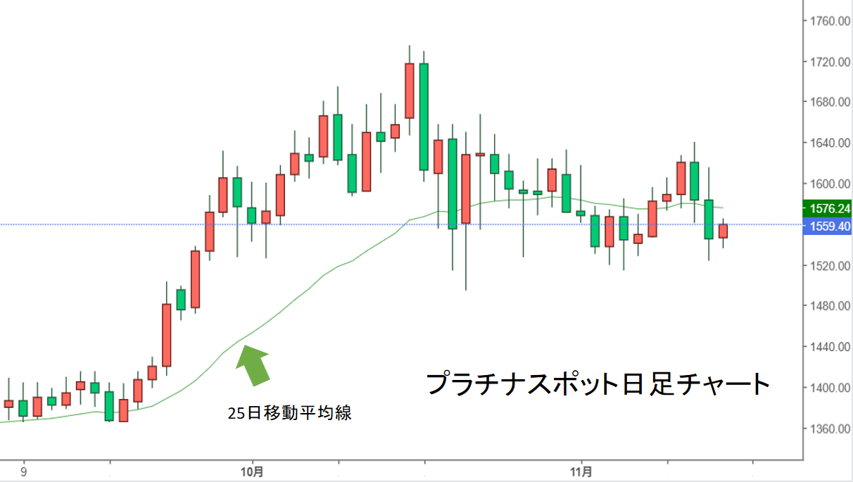 こちらのチャートは、プラチナスポット日足になります。10月17日以降から25日線の勢いがなくなってきたように思います。まだ横向きであるため、売り叩かれにくいと思いますが、①ドル円が154円後半で推移(日米ともに円安は望まない)②プラチナスポットが1500ドル台で推移(中国実需はほとんど買っていない)などから、強気は避けたいと思います。よって、レンジ相場か、若しくは再び〇〇〇〇円まで下落する相場を予想しています。(今のプラチナ相場を支えているのは、インフレのみだと考えます)