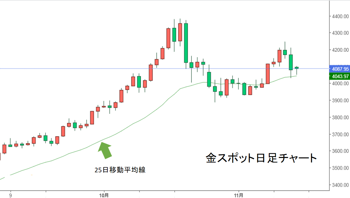 今回は、10月17日に大陰線を演じたため、その後の25日線はほとんど勢いがなくなったように思います。これが、通常の金相場に思えます。つまり、10月が異常だったということです。10月の相場を意識しすぎると、大失敗に繋がりますので、常に資金配分を考えながら、枚数のコントロールをしていきましょう。