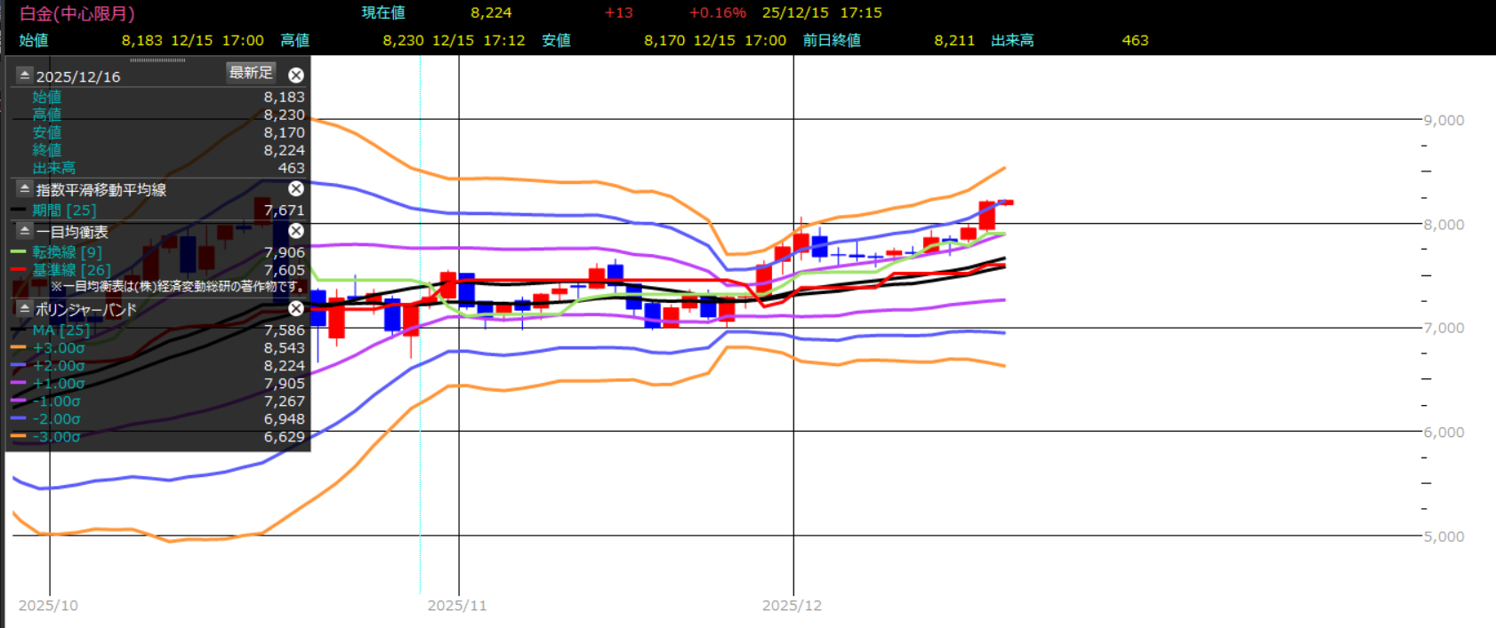 こちらのチャートは、大阪白金日足に、25日移動平均線、一目均衡表(転換線、基準線)、ボリンジャーバンドを重ね合わせております。①前日安値7919円②一目均衡表転換線7906円③ボリンジャーバンドσ=+1は7905円となっております。15日は大陽線となったことで、おそらく短期的に8000円は割り込まないと考えます。