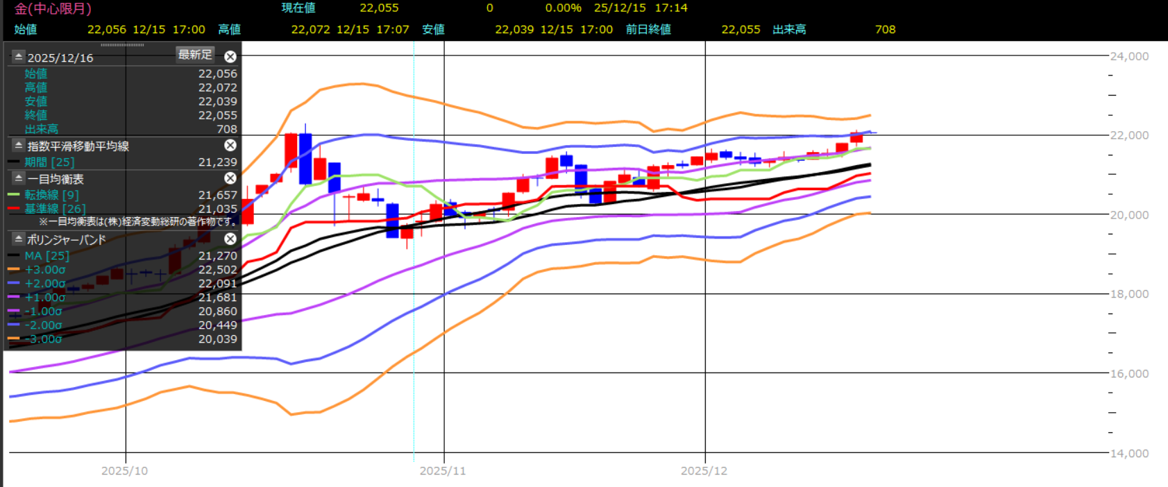 こちらのチャートは、大阪金日足に、25日移動平均線、一目均衡表(転換線、基準線)、ボリンジャーバンドを重ね合わせております。繰り返しになりますが、100%のテクニカル指標はありません。組み合わせることで、勝利の確率を上げることができます。