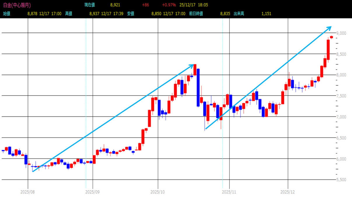 こちらのチャートは、大阪白金日足になります。1回目の上昇は、今年8月4日に安値5686円を付け、10月17日高値8250円と、2564円上昇した相場です。次に今回の相場ですが、10月22日安値6666円を付け、現時点(18:10)で2271円上昇していることになります。仮に、前回の上昇のように2564円幅安値から上昇するのであれば、9230円が見えてきます。